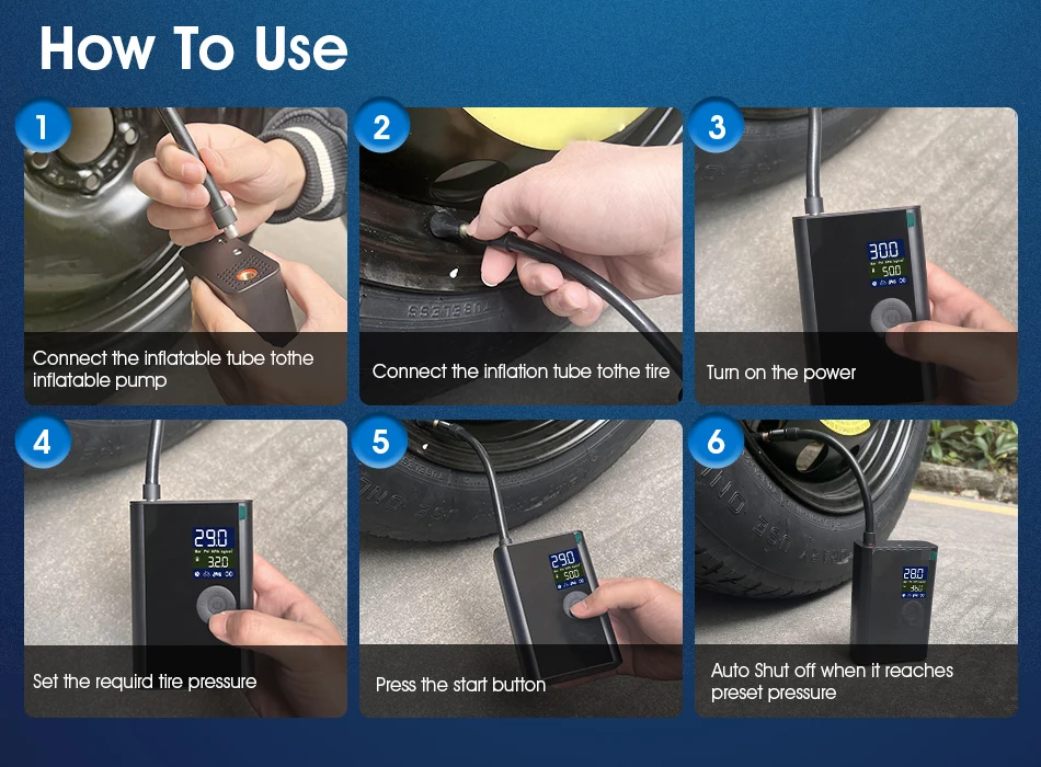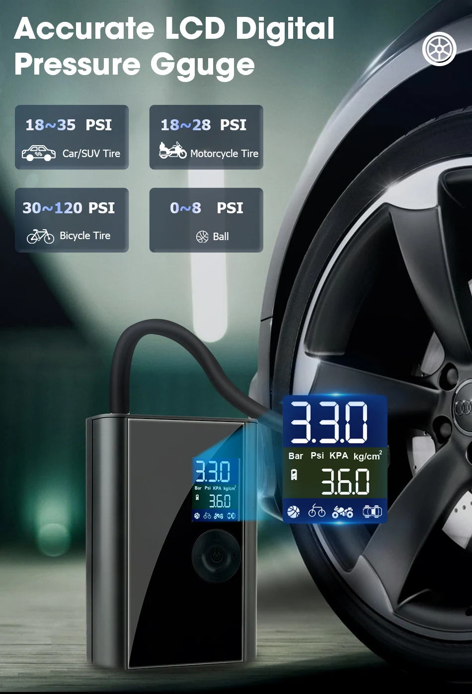 Long-lasting LED LightOur portable air compressor provides long-lasting lighting for up to 10 days and makes it for convenient use in low-light environments.It is a helpful companion under emergency or daily use.